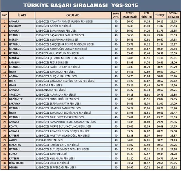 Öte yandan YGS-2015'te her şeye rağmen sıralamada ilk 3'te yer alan liselerin Özel Fen Lisesi olduğu anlaşılıyor. İlk 100'e toplamda 30'dan daha az devlet okulunun girdiği gözlenirken, sıralamada ilk 3'te yer alan okulların tarihçeleri ve başarıları arasında şunlar bulunuyor: