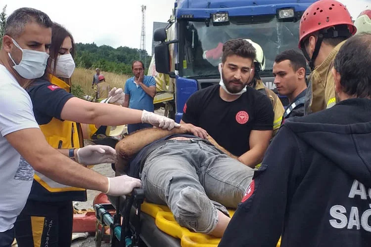 İtfaiye ekipleri sürücü koltuğunda sıkışan TIR şoförünü dorsesini keserek çıkarttı.