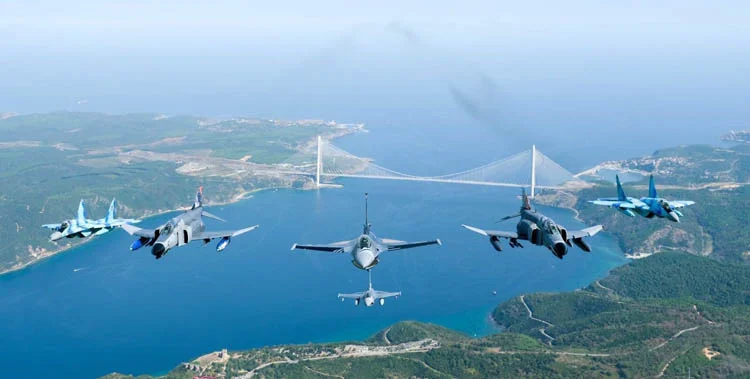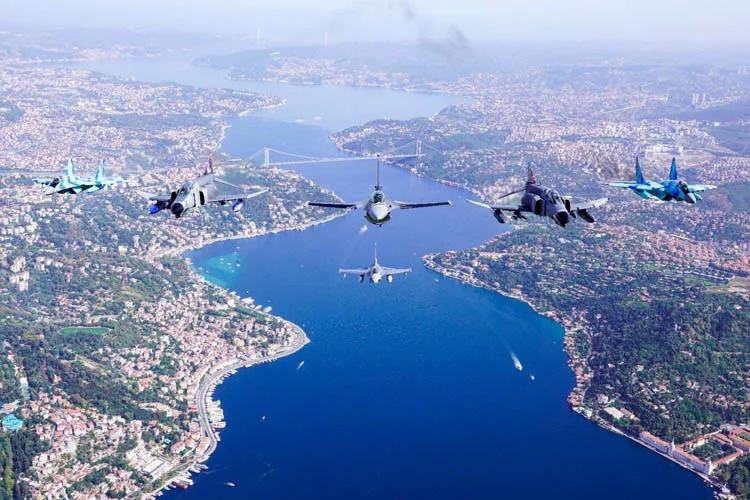 Savaş uçakları Havacılık, Uzay ve Teknoloji Festivali (TEKNOFEST) 2021 öncesi İstanbul Boğazı semalarında selamlama uçuşu gerçekleştirdi.