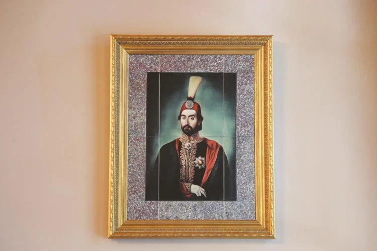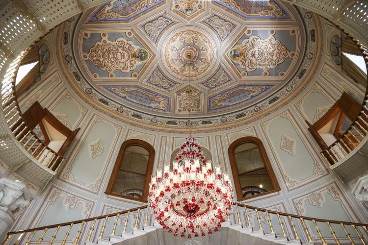 Kasrın giriş katındaki büyük dikdörtgen salona, uç kısımda yer alan mermer sütunlu revaklardan girilmektedir. Her köşesinde birer oda bulunan bu salonun tavanı bağdadi sıva üzerine kalem işi bezemelidir. Üst kata çıkan çift kollu anıtsal saltanat merdivenleri ise yapının en etkileyici bölümlerinden biridir.