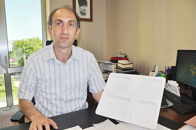 Tabldot tabaklarına gelince… Bakınız, bu tabaklar Beykoz Belediyesi'nin tescilli ürünüdür! Yani bu tasarım ve patenti bize; Beykoz Belediyesi’ne ait. Tabaklarımızın çok önemli bir özelliği daha var: Geri dönüşüme gitmesi… Daha önceki köpük tabakları artık kullanmıyoruz. İşte bu tabakları kullanıyoruz. Yemek bittikten sonra tüm tabakları geri dönüşüme gönderiyoruz. Çevreye de duyarlı bir iş yapıyoruz; örnek bir iş yapıyoruz."