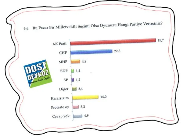 Bu Pazar genel seçim olsa hangi partiye oy verirsiniz sorusunda ise AK parti 12 Haziran 2011 Seçimleri’ne göre Beykoz’da 7 puan oy kaybetmesine rağmen % 45, 7’lik oranla CHP’ye ezici bir üstünlük sağlıyor… CHP genel seçimlerde % 22,3’de kalıyor…